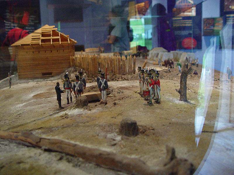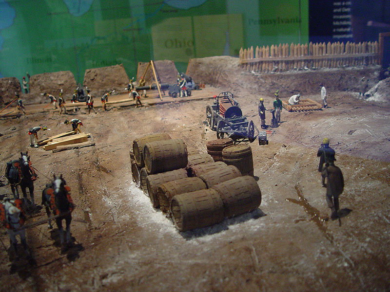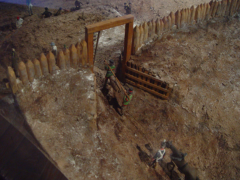 In one of the blockhouses they have a fairly large diorama of the fort under construction, looks to be about 54mm scale. I took pictures as best I could through the glass...